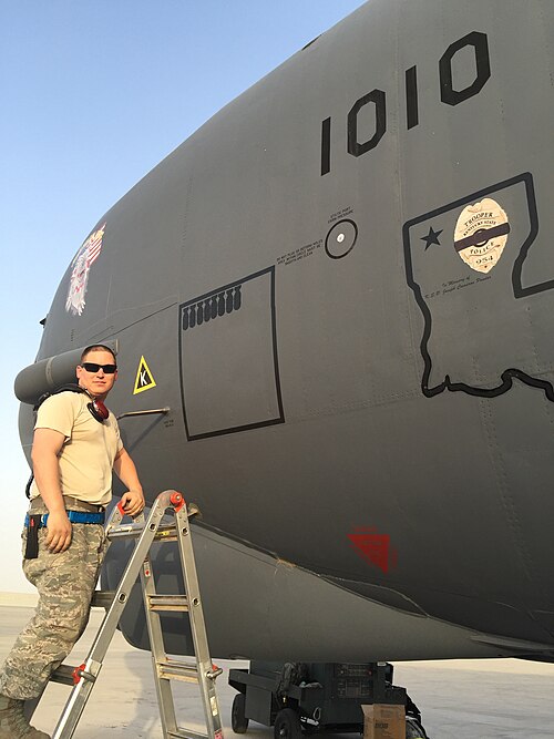 Here’s a selfie in 20 March 2023 of “B-52 Crew Chief SSgt Figueroa stenciling completed bombing sorties on B-52H (61-0010) during Operation Inherent Resolve, in part of the Military intervention against ISIL at Al Udeid Air Base, in Qatar.”